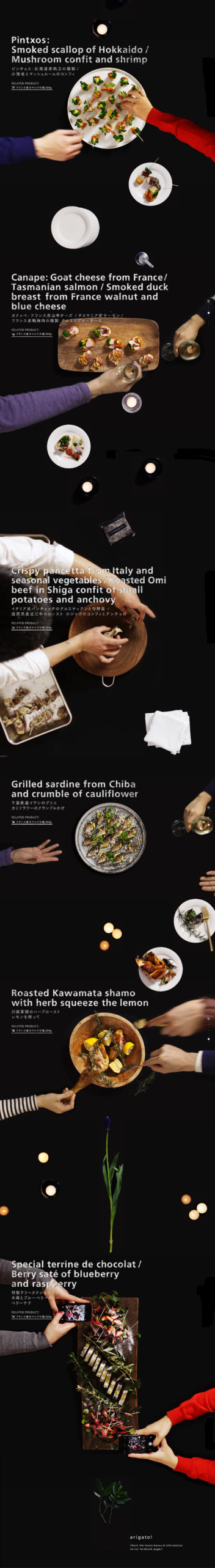 料理、アート、音楽、空間などの企画・運営・販売等を行っている、arigato Inc.のサイトを制作させていただきました。メイン事業である、飲食店plate tokyoとケータリング事業を軸にサイトを構成。"Smiles are Contagious" ( 直訳: 笑顔は伝染する ) という企業コンセプトを体感していただくために、まるでその場を切り取ったような写真や音楽、動画を用いて世界観を作り上げました。目で見ても美しい、食べてもおいしい、そんなお料理とともに、一つの長いダイニングテーブル上で繰り広げられる、とある日のディナーとパーティーの様子を映し出しています。