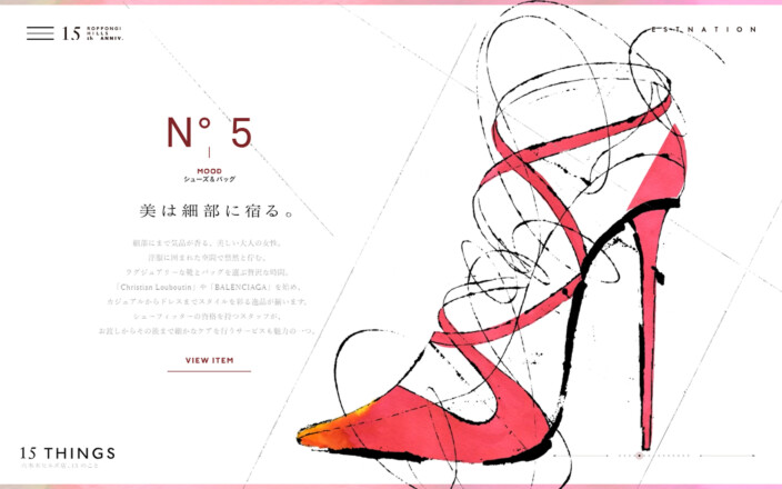 スペシャリティストア ESTNATION 六本木ヒルズ店15周年スペシャルサイトの企画・制作をいたしました。六本木ヒルズの施設開業と同時に生まれた ESTNATION 六本木ヒルズ店が15周年を迎えました。広大なフロアとスケール感。ブランド・ジャンルを横断できる豊富な商品。緊張感とエレガンスを併せ持つセレクト。知識豊富なスタッフ。そしてなにより、なにかお気に入りのモノ・コトに出会えるという期待感。お店を訪れたときのそんなワクワク感をスクリーン上でも感じられるウェブサイトを目指しました。お店のスケール感を抽象的に表現したトップのアニメーション。15の視点から魅力を語る15 THINGS。ESTNATION らしい知性と色気のあるイラストとテキストで表現しています。来店した人だけがアクセスできるプレゼントキャンペーンもSS、AW、クリスマスとシーズンごとに実施し、キャンペーン期間中は、六本木ヒルズ店の店頭や、メトロハットという六本木ヒルズの大型モニターでもアニメーションが放映されました。