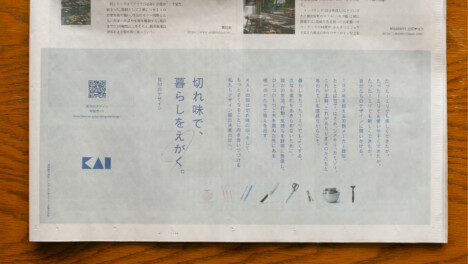 制作したWebサイトはさまざまなメディアへも展開しました。貝印のコンセプトデザイン展示「切れ味とやさしさ展」の会場に流れる縦型サイネージ映像を制作。展示空間に適した見え方を検証しつつ、Webサイトと同じ世界観で制作しました。また、今回制作したデザインフィロソフィーは、日経新聞の広告として掲載されました。サイネージと新聞広告は、プロジェクトを進めるなかで派生的に生まれたメディアで、Webサイトに閉じずに、媒体に合わせて最適な見え方を検討していきました。Webを起点にしながら、メディアを越えて貝印のデザインを届ける施策になりました。