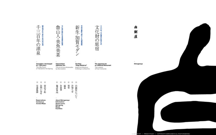 老舗旅館「白銀屋」のプロモーションサイトです。380年の歴史をほこる本館( 白銀クラシック )の魅力と加賀建築様式を受け継ぎモダンに生まれ変わった新館( 加賀モダン )の魅力を訴求することを目的としています。白を基調とした、無駄のないデザインの中で、情緒的な写真とコピーを、空間を意識した奥行ある動きで演出することによって、老舗旅館の本質を表現しています。