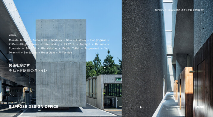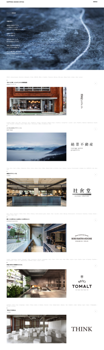 建築家 谷尻誠さん、吉田愛さんが率いる建築設計事務所 「SUPPOSE DESIGN OFFICE」 のウェブサイトを弊社にて企画・制作させていただきました。弊社を卒業した芹澤千尋を中心に数か月の会話を経て、SUPPOSE DESIGN OFFICE さんがやっていることは、・場所と動きをつなげ状況を生む・条件と発想をつなげ価値を生む・建築と世の中をつなげ景色を生む・人と人をつなげ化学反応を生むことであると同時に伝えるべきことであると定め、「バラバラなまとまり」という言葉にたどりつきました。プロジェクトと事務所の方々が中心に見えるシンプルな構成とデザインを心がけています。プロジェクトを構成するさまざまな要素と要素をつなげ合わす「+」、その答えを「=」に置き換えデザインのアクセントとし、各デバイスごとに写真を大きく見やすく見ていただけるよう工夫しています。ぜひ、ご覧ください。