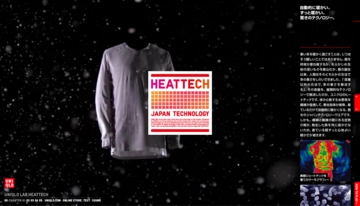 UNIQLOのHEATTECHのプロモーションサイトです。HEATTECHの発熱と保温、薄さと軽さと体にフィットする伸縮性、抗菌防臭や静電気防止などの「優れた機能性を訴求すること」と「商品ブランドの認知を促進すること」を目的としています。雪景色の中に浮かんでいるHEATTECHをキービジュアルに据えて、機能をしっかりと伝えることを念頭に置いた映像を制作。また、ただ情報を伝えるだけではなく、より楽しんでいただける工夫として、映像と音楽をリアルタイムにコントロールできる新感覚のインタフェースを導入しています。