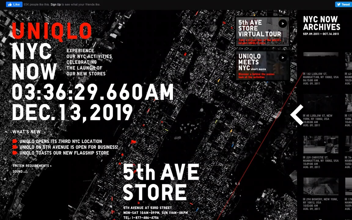 2010年10月のUNIQLO NYC 5番街店 / 34丁目店のオープンに向けたブランドサイトです。オープン前から、NYCの地図を背景にしたタイムライン上に、8月から派遣したカメラマンがUNIQLOの広告にジャックされていくNYCを撮りためた映像や、ストア、イベントの情報などをウェブサイトに日々アップロードし、UNIQLOとNYCの“今”を表現しました。オープン後には、撮りためた素材で集大成となる映像を制作し、ウェブサイトも同時リニューアル。ビジュアライゼーションされたNYCの地図上に、3店舗がプロットされ、撮影したすべての映像も掲載。NYCにUNIQLOが今もなお存在することをアピールするウェブサイトとなりました。