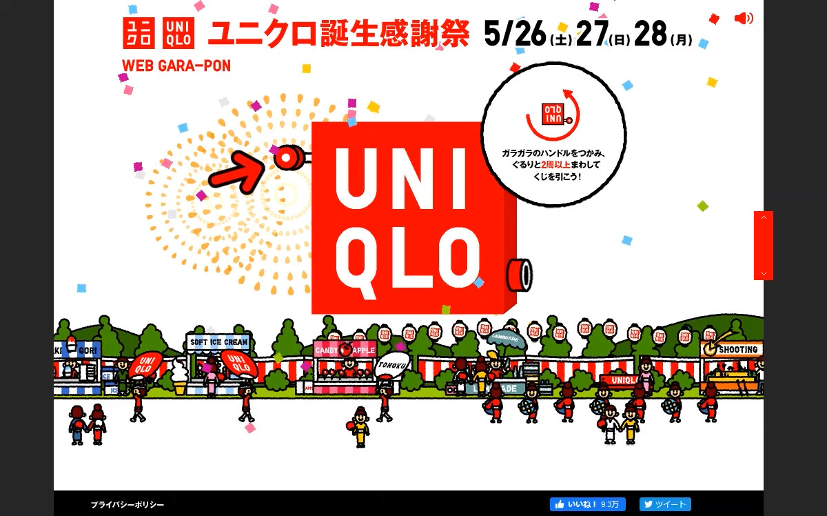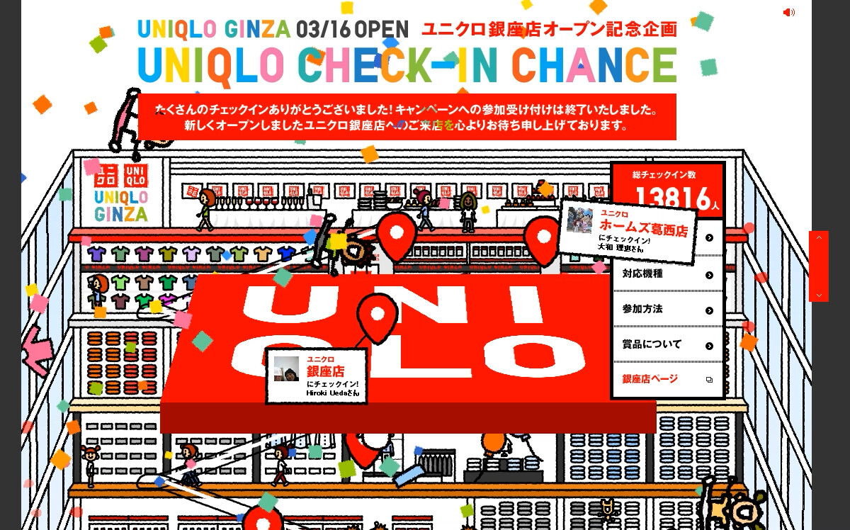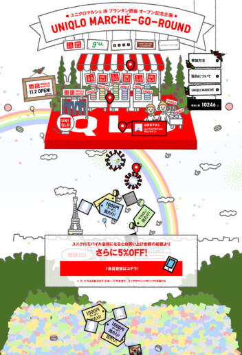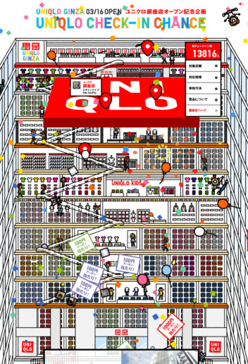 UNIQLOの創業感謝祭の特別企画サイト「CHECK-IN CHANCE」では、全国の店舗でFacebookでチェックインすることでクーポンと世界一周旅行があたるキャンペーンをおこない、6日間で20万を超えるチェックインを達成しました。創業感謝祭の特別企画ということで、にぎやかなお祭り感が伝わることを目指しました。その後も、世界最大売り場面積を誇る銀座店のオープン記念「CHECK-IN CHANCE | GINZA UNIQLO」、28周年誕生感謝祭特別企画ではSNSと連動してガラガラをまわすことで抽選に参加できる「WEB GARA-PON」、プランタン銀座店オープンを記念した「MARCHE-GO-ROUND」、年末年始特別企画「NEW YEAR GARA-PON」と、オンライン上でクーポンやギフトが当たるキャンペーンサイトを5点制作しました。