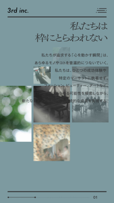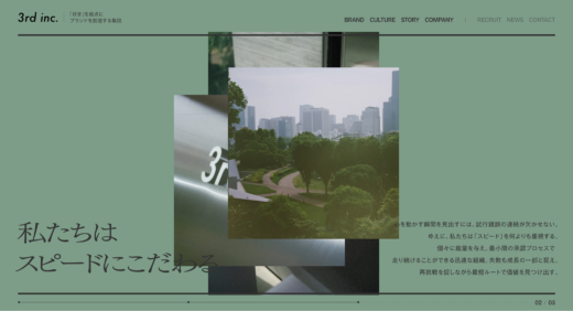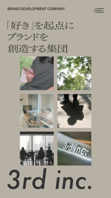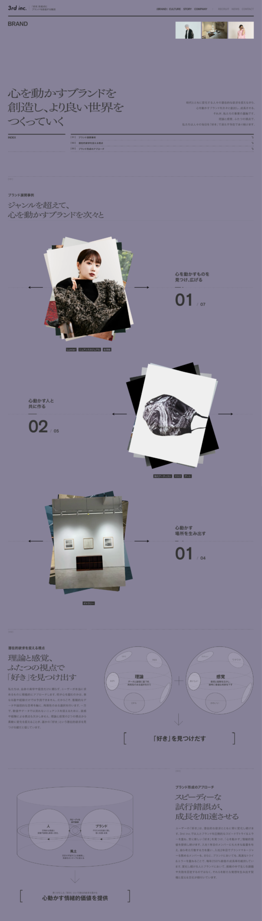 3rd株式会社のコーポレートサイトを企画・制作しました。同社のブランド創造に対する価値観や、今後目指してく未来像をビジュアルとインタラクションで表現しています。