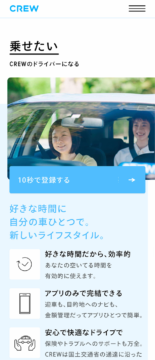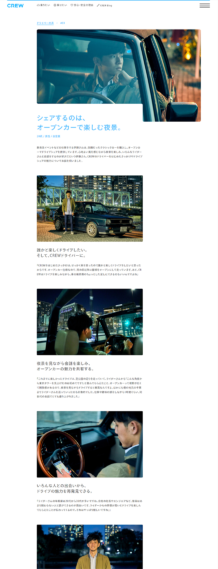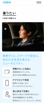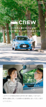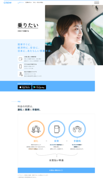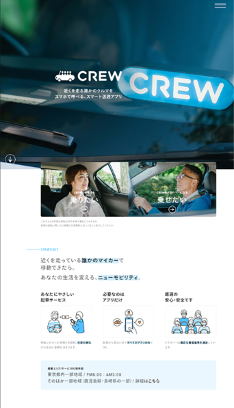 スマホで呼べる、スマート送迎アプリ「CREW」のウェブサイトを制作させていただきました。CREW は「乗りたい」ひとと「乗せたい」ひとをつなぐ日本初の移動手段となるサービス・アプリです。一般的に認知されていない新形態のサービスであるため、制度面はもとより法律面でも安心して使えるということをわかりやすく伝えることに注力しました。「おじゃまします」「ありがとう」といった日本ならではの気持ちが通う移動体験ができますのでぜひご利用ください。