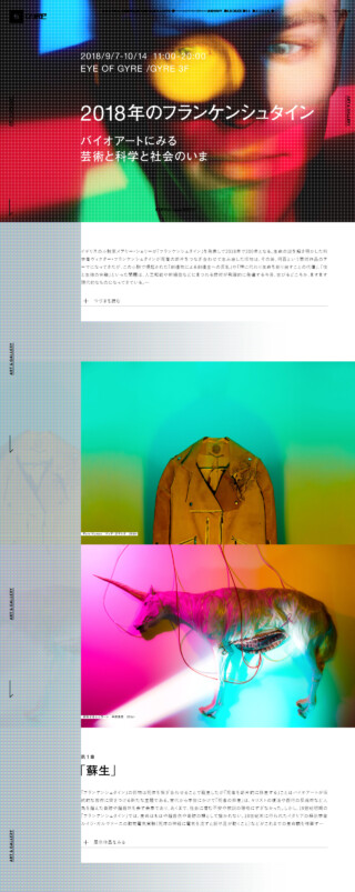 ART&GALLERY - 2018年のフランケンシュタイン - バイオアートにみる芸術と科学と社会のいま _creative direction, art direction, design: 林 英和 ( mount inc. ) / technical direction, development: 梅津 岳城 ( mount inc. ) / design: 吉田 結 ( mount inc. ) / project management: 芹澤 千尋 ( mount inc. ) / development: 田島 真悟 ( Lucky Brothers & co. ) / writing: 髙橋 洋介 ( 金沢21世紀美術館 ) / photograph: UTSUMI