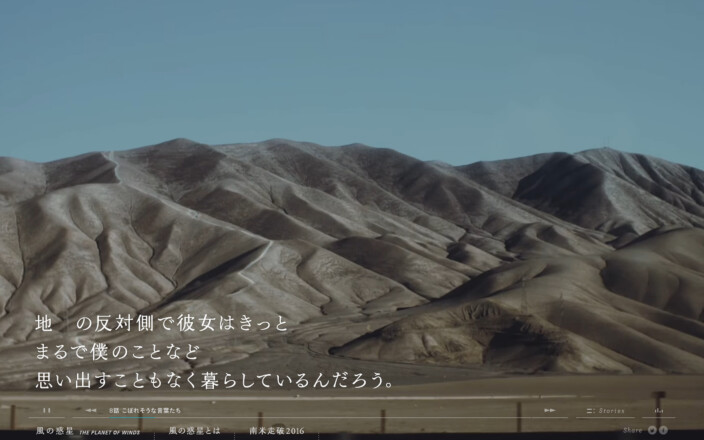 2014年に始まったTOYOTA GAZOO Racingの5大陸走破プロジェクトは3回目の2016年に南米走破に挑みました。「風の惑星」では、南米を走行するクルマたちの旅の記録から誕生した、ひとつのエンターテイメントです。小説「風の惑星」では、ある言葉を発音できなくなってしまった男による南米の旅。アニメーションではひとりの男がランクルに乗って世界を駆ける旅。南米走破2016では実際にTOYOTAの社員のみなさんがクルマとともに道を感じる南米大陸走破の旅。走破プロジェクト中に撮影したライブ感ある映像を使うことで、どこかへ旅に出たくなるような、リッチな映像体験ができるコンテンツとなっています。アニメーションのイラストは浅野忠信さん。「風の惑星」の朗読は佐藤健さん。音楽はくるりの岸田繁さんが手がけました。