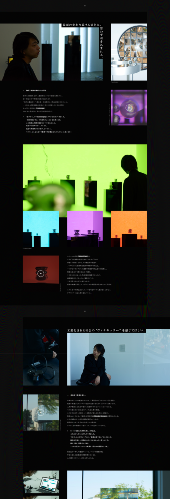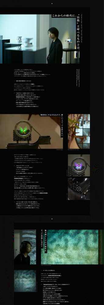 GYRE GALLERYにて開催された、落合陽一氏の個展「落合陽一、山紫水明∽事事無碍∽計算機自然」のプロモーションサイトを企画・制作しました。メディアアーティスト、そして科学者として世界的な注目を集める落合氏の作品群は、非常に奥深く、時に難解なテーマを内包しています。本プロジェクトでは、その複雑な世界観をユーザーにわかりやすく届けるため、落合氏本人へのロングインタビューを主軸としたコンテンツを設計しました。作品や会場の様子をあえて「断片的」に切り取った写真や動画で、まるで落合氏本人に案内されながら、一緒にギャラリーを巡っているかのような「シズル感」と「没入感」を演出しています。展示を訪れる前の期待感や理解度を高めるだけでなく、鑑賞後に余韻を反芻し、思考を深めるためのコンテンツとしても機能する、展覧会体験を拡張する場を目指しました。