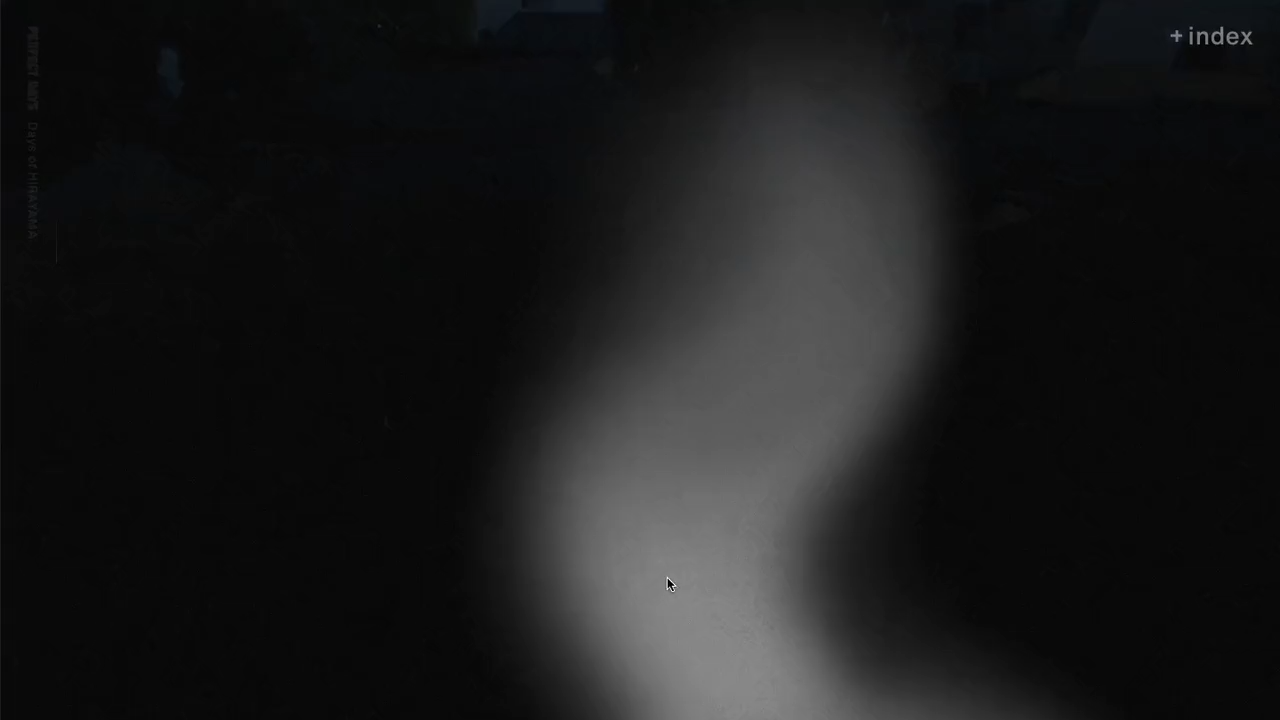 「Days Of Hirayama」では、ページをスクロールする行為そのものが物語体験へと変換されます。画面に表示される文章の進行に合わせて、竹ぼうきで道を掃く音、カラスの鳴き声、雨音、遠くを走る車の気配など、映画の音素材をもとに細かくチューニングされた117個の環境音が自然にミックスされて再生されます。うっすらと光の差す黒い背景に文字だけが流れる状態から、ユーザーのアクションによって木漏れ日を写したビジュアルと文章が重なる構成へと移り変わります。これは、作中の平山がときおり自分のカメラを向ける行為を手がかりに、「彼が見ていた、あるいは撮ったと想定される景色」を画面上に示すためのものです。音、文字、画面の変化、操作を重ね合わせることで、物語を外側から読んでいた視線が、いつの間にか平山が風景を見つめる視点へと近づいていく。その緩やかな移行そのものが、読み手の記憶に残るよう意図しています。