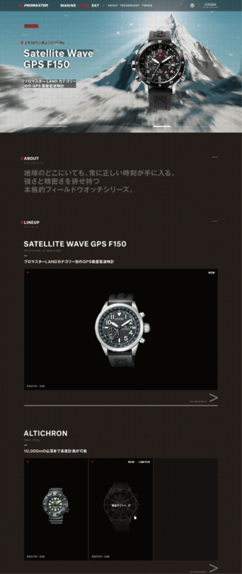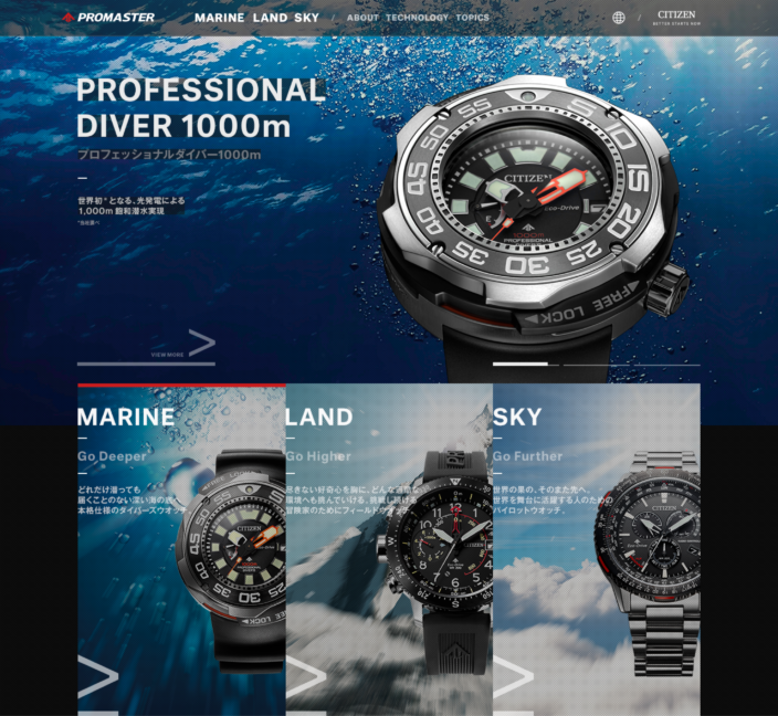 シチズンの「PROMASTER」ブランドのウェブサイトのリニューアルをさせていただきました。PROMASTER はシチズンの技術を結集したプロフェッショナルスポーツウオッチブランドです。MARINE(ダイバーズウオッチ)、LAND(フィールドウオッチ)、SKY(パイロットウオッチ)3つのシリーズを展開しており、1989年の誕生以来、世界中の冒険者達と共に限界を超えて挑戦し続けています。今回のリニューアルでは、情報設計から、UIデザインまで行い、製品一つ一つが正確に分かりやすく伝わること、かつPROMASTER のブランディングが実現するサイトを目指しました。運用面でも、管理しやすさを配慮した更新性の高い実装を行いました。