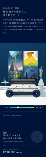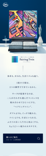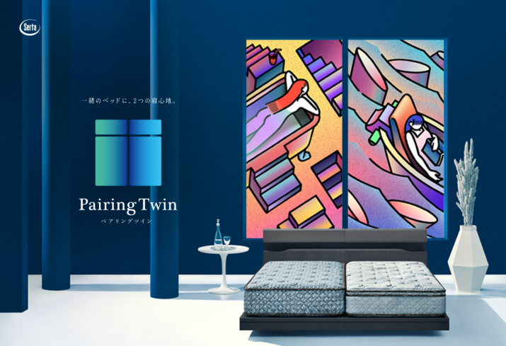 受注生産のマットレスブランド・サータのペアリングツインの紹介ページの制作をさせていただきました。ペアリングツインとは、寝心地が異なる2台のシングルマットレスを組み合わせてひとつにできる、新しい眠りのカタチです。かたさ・やわらかさ、あっさり・しっとり、スリム・ボリュームなど、様々な寝心地が選べるサータならではの商品です。夫婦やカップルの間で寝心地の好みが分かれていた場合でも、柔軟に対応できます。今回、代表的な6つのペアリングの寝心地をモチーフに6組のアーティストが描き下ろした“寝心地アート”を紹介しています。組み合わせによる新しいベッドの可能性を感じられるような、印象的な世界観を目指しました。