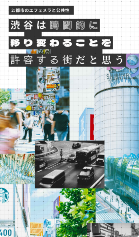 ART&GALLERY - 未来都市シブヤ:エフェメラを誘発する装置_creative direction, art direction: 林 英和( mount inc. ) / planning, design: 渡辺 俊( mount inc. ) / planning, project management, direction: 楠本 莉沙( mount inc. ) / planning, development: 須多 望( mount inc. ) / planning, design: 劉 逸葳( mount inc. ) / development: 寺田 奈々( mount inc. ) / edit, writing: 村岡 俊也 / photography (Shibuya Town and Exhibition Hall): 金本 凜太朗 / photography (Shibuya Town): 劉 逸葳(mount inc.), 渡辺 俊(mount inc.)