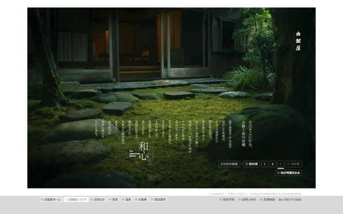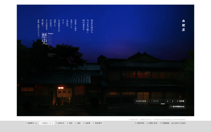 老舗旅館「白銀屋」のプロモーションサイトです。380年の歴史をほこる本館( 白銀クラシック )の魅力と加賀建築様式を受け継ぎモダンに生まれ変わった新館( 加賀モダン )の魅力を訴求することを目的としています。白を基調とした、無駄のないデザインの中で、情緒的な写真とコピーを、空間を意識した奥行ある動きで演出することによって、老舗旅館の本質を表現しています。