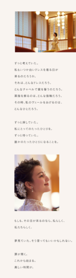 美しく澄み切った叙情性豊かな映像の監督は林響太朗さん。きらびやかで透明感のある写真は土井文雄さん。映像の脚本の長谷部千彩さんにはサイト全体を通したモノローグコピーでもウェブサイトに新婦の心情を宿していただいています。また制作にあたり、オークラのみなさまの多大なるご協力がありコンテンツを完成させることができました。
