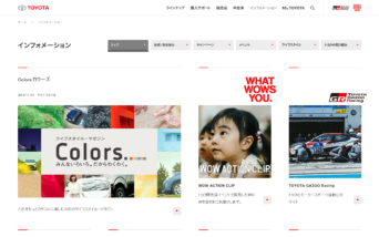 車を買う時のわくわく感、楽しさ、購入プロセスにおける利便性、わかりやすさ、購入後に楽しく車を使いこなしや再度TOYOTA車を検討していただけるようなサイトづくりをしました。 TOYOTA.jp 全体については、すべてのコンテンツの在り方を根本的に見直し、コンセプトワーク、プロジェクト設計管理、構造設計、ビジュアルデザイン、実装まですべての工程をチームにて取り組みました。他に、「ラインナップ」、「購入サポート」、「インフォメーション」の3ページもリニューアルしました。