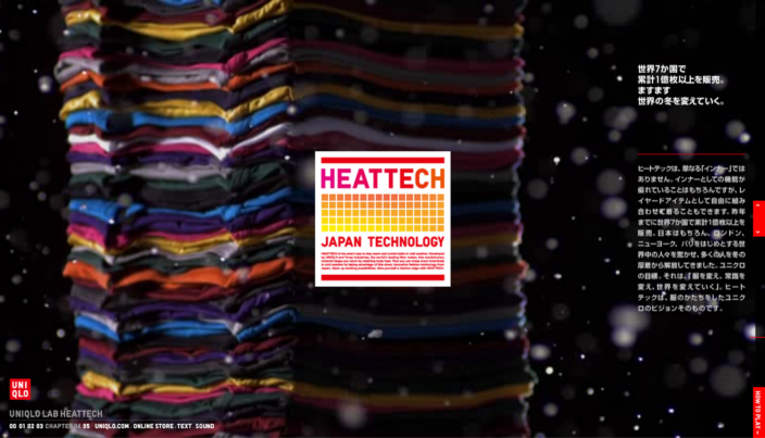 UNIQLOのHEATTECHのプロモーションサイトです。HEATTECHの発熱と保温、薄さと軽さと体にフィットする伸縮性、抗菌防臭や静電気防止などの「優れた機能性を訴求すること」と「商品ブランドの認知を促進すること」を目的としています。雪景色の中に浮かんでいるHEATTECHをキービジュアルに据えて、機能をしっかりと伝えることを念頭に置いた映像を制作。また、ただ情報を伝えるだけではなく、より楽しんでいただける工夫として、映像と音楽をリアルタイムにコントロールできる新感覚のインタフェースを導入しています。