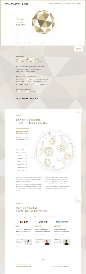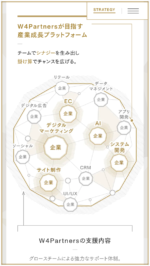 デジタル企業の産業成長プラットフォーム「W4Partners」のウェブサイトを制作しました。シンボルマークに込められた、企業が集まり、輝き・結晶をつくるという想いを、ロゴアニメーションにのせ表現しました。
